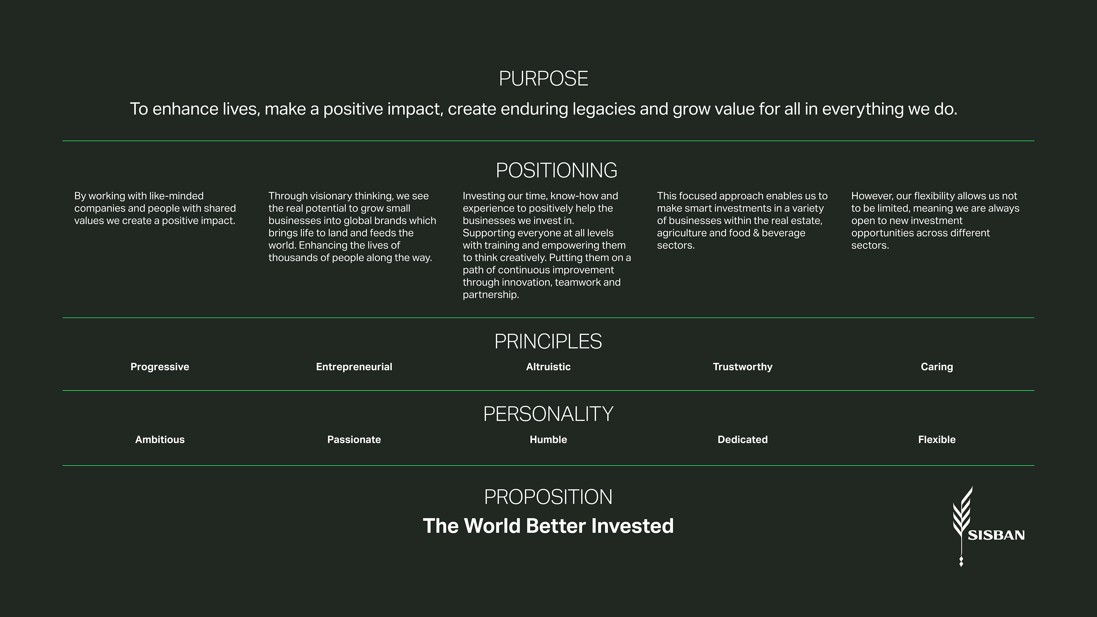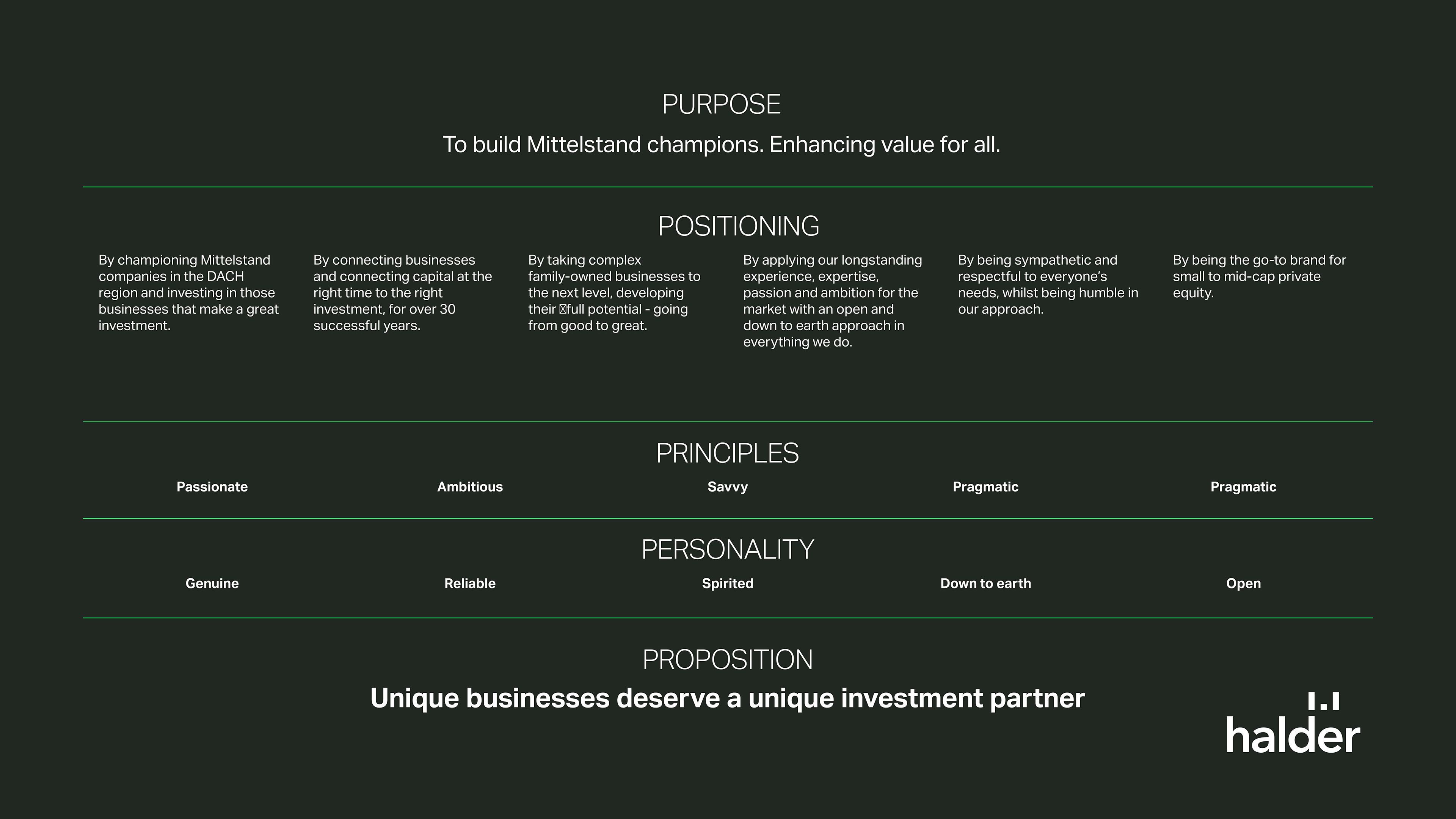 Below are three brand DNA overview examples. Two from investment companies, one from Germany and the other from Saudi Arabia, but with very different models. And the third for an international cyber security firm.