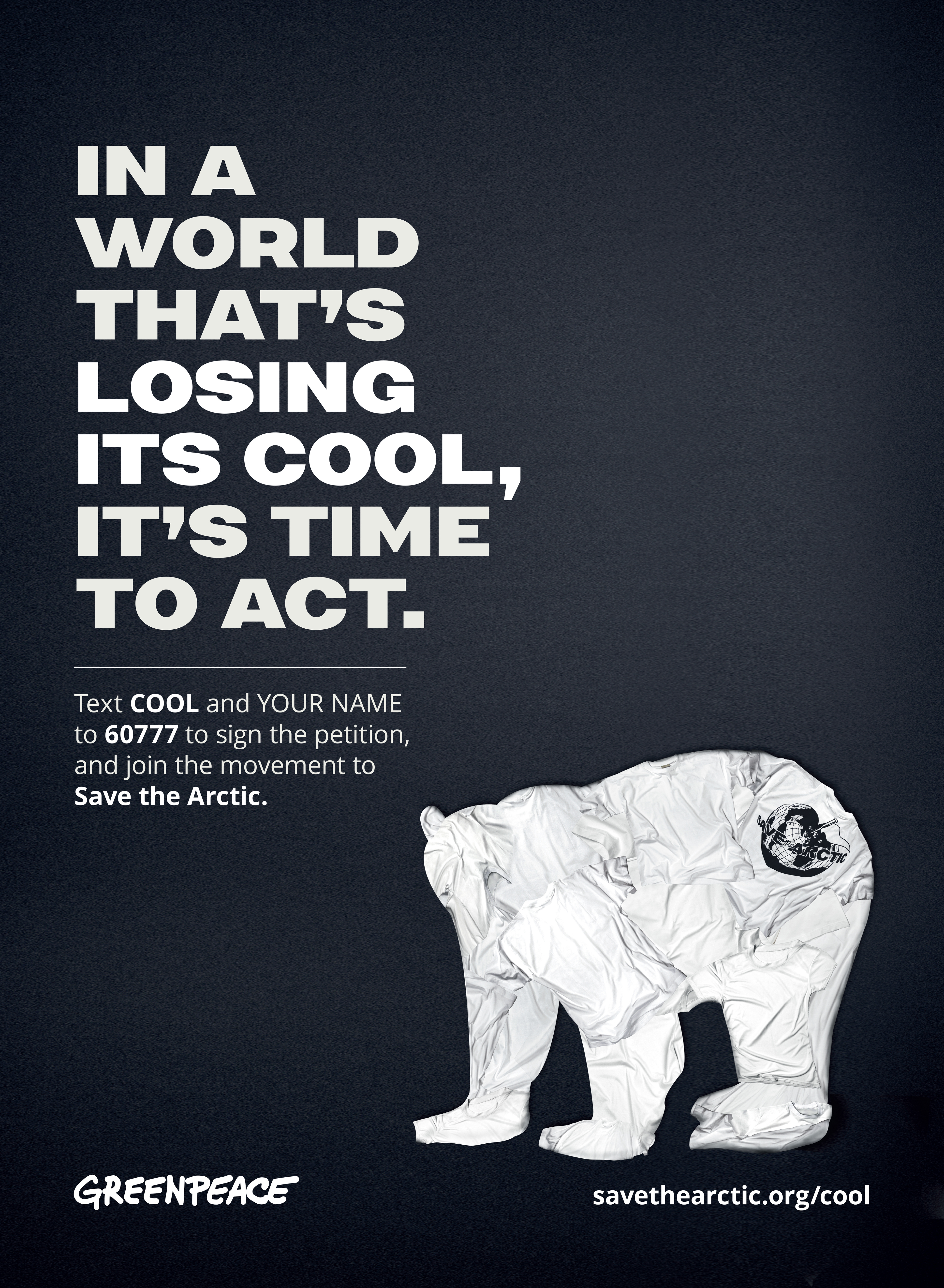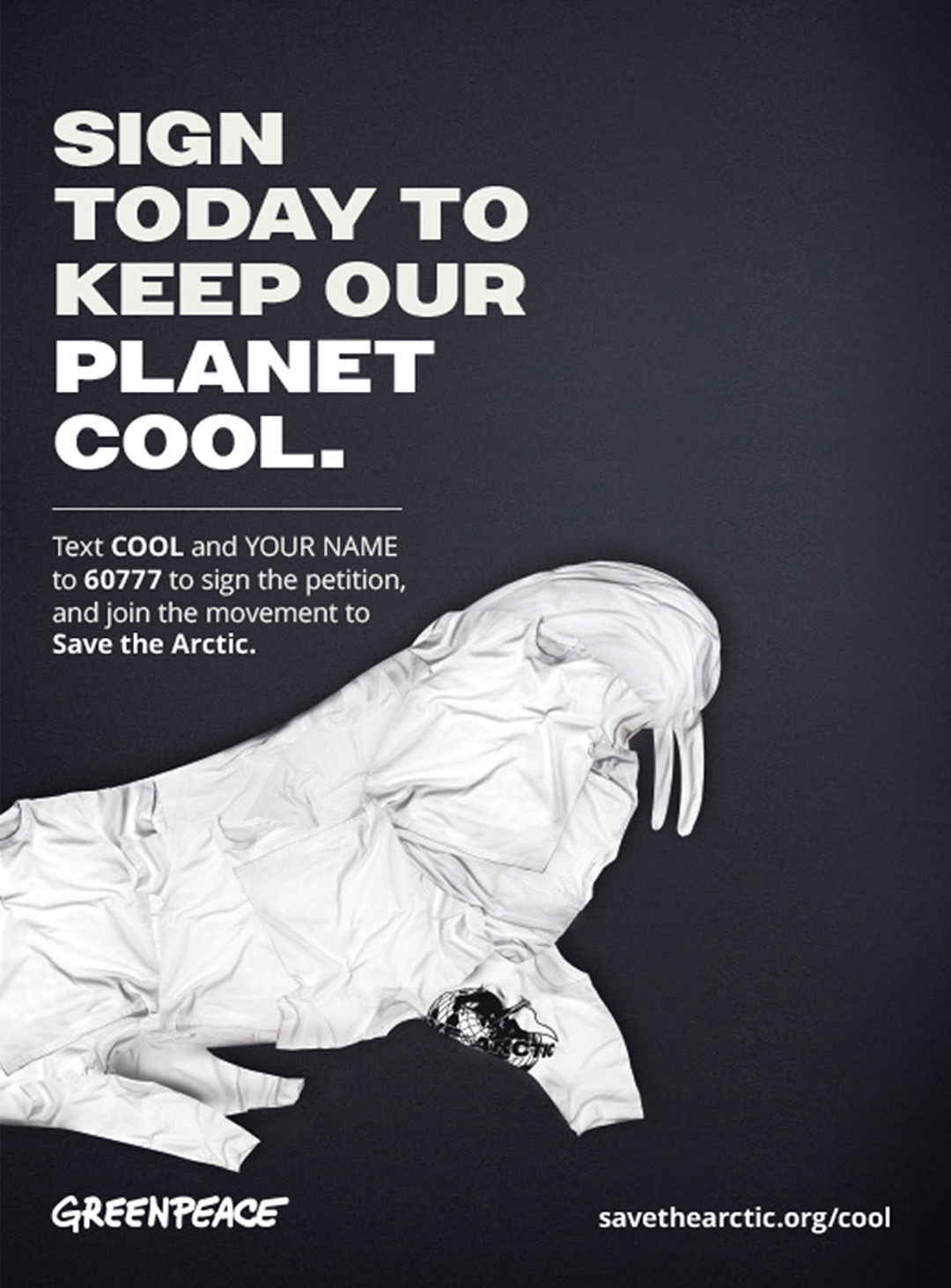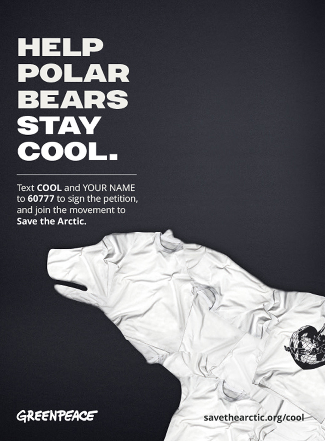 To connect the Dame Vivianne Westwood's T-shirts worn by the stars with the campaign messaging I decided to create a set of the endangered Arctic animals formed out of the T-shirts. Each T-shirt animal was then supported by punchy copy and a call to action. These were interspersed between the celebrity images created by Gotts. The campaign was strategically place on the Waterloo underground close to the Shell Centre, the oil producer involved in oil exploration of The Arctic.