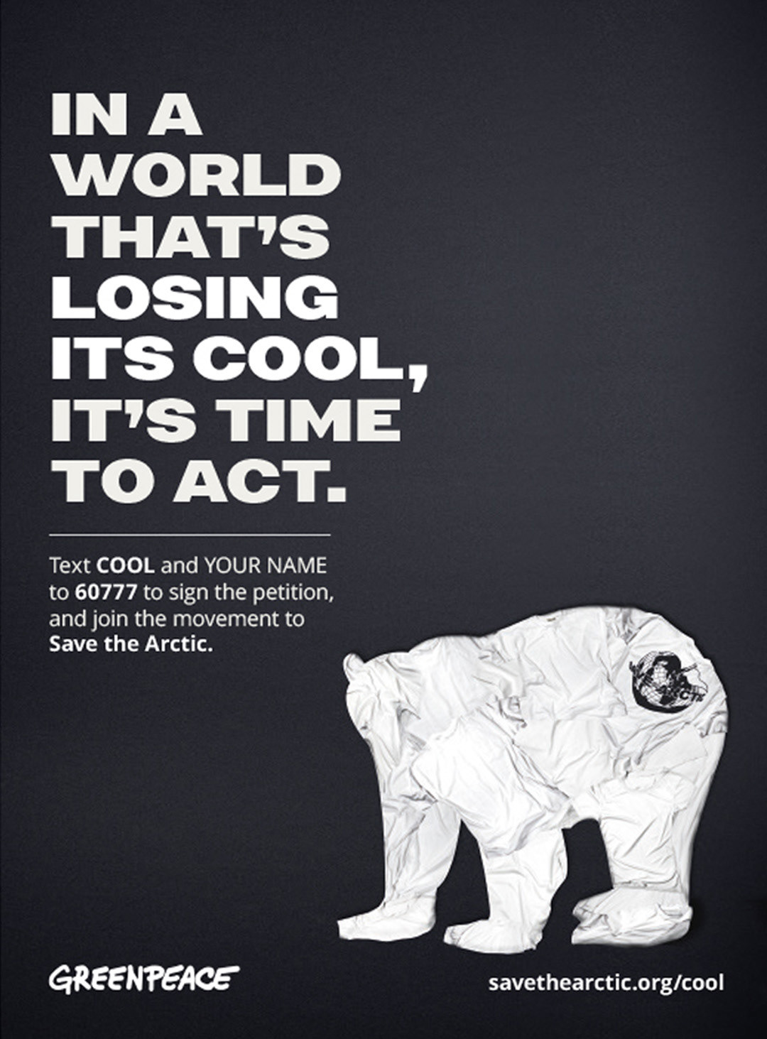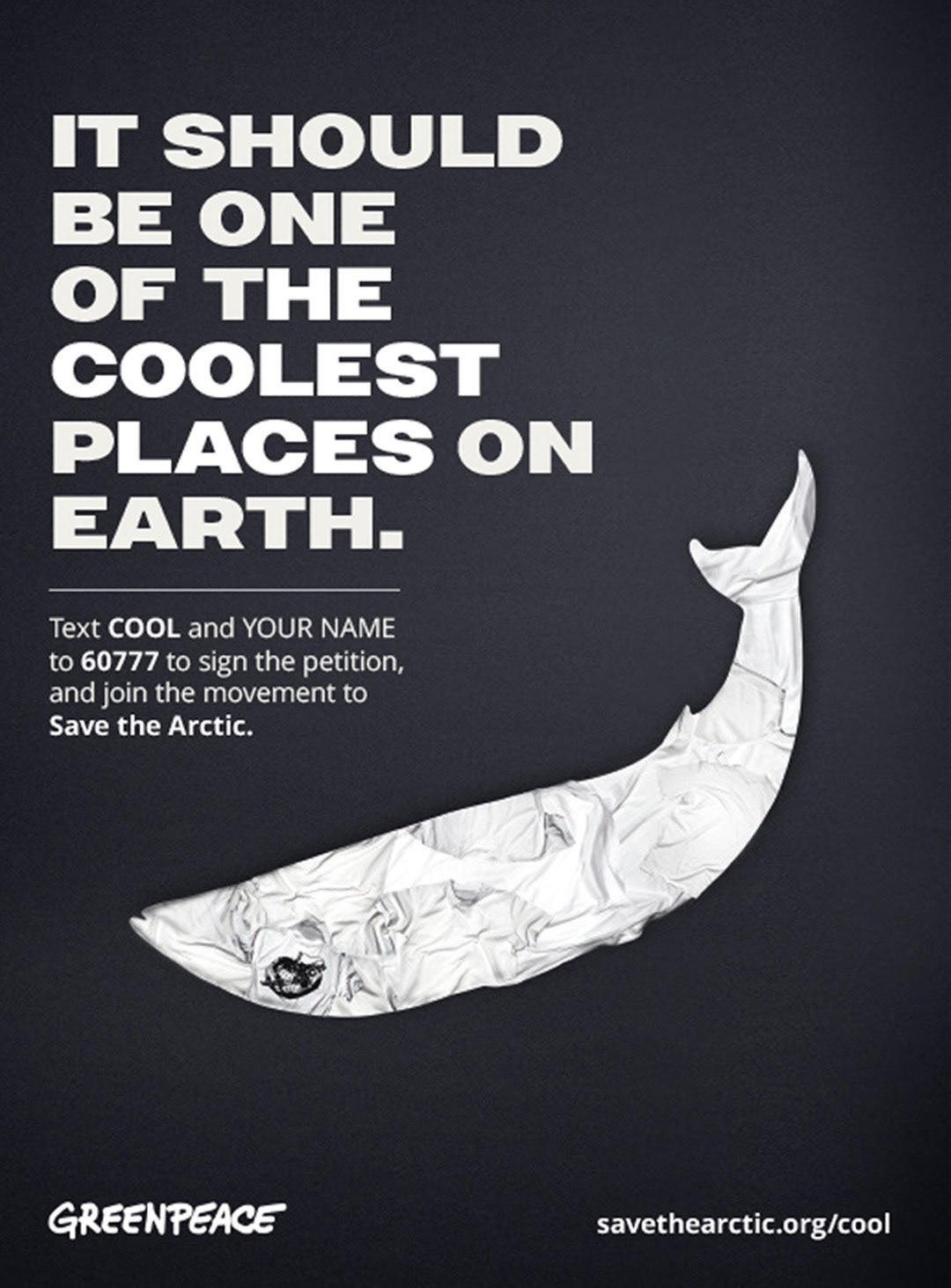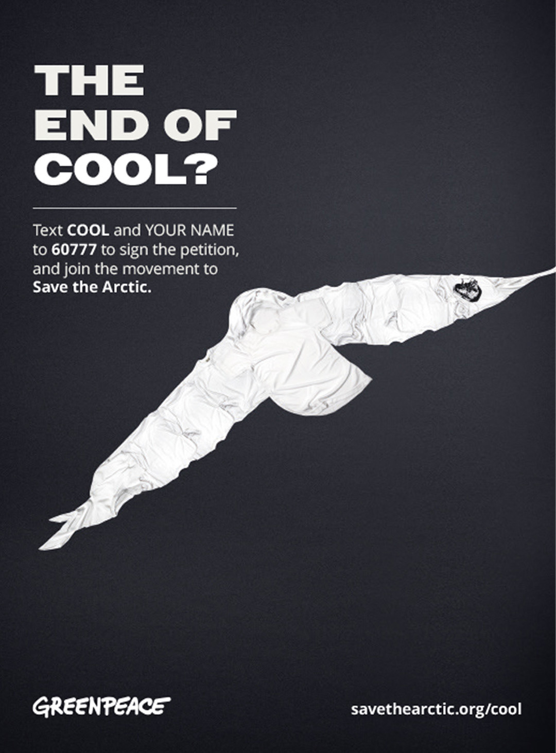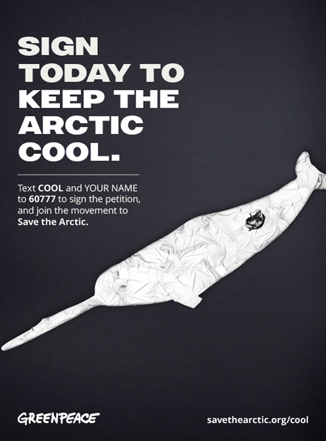 To connect the Dame Vivianne Westwood's T-shirts worn by the stars with the campaign messaging I decided to create a set of the endangered Arctic animals formed out of the T-shirts. Each T-shirt animal was then supported by punchy copy and a call to action. These were interspersed between the celebrity images created by Gotts. The campaign was strategically place on the Waterloo underground close to the Shell Centre, the oil producer involved in oil exploration of The Arctic.